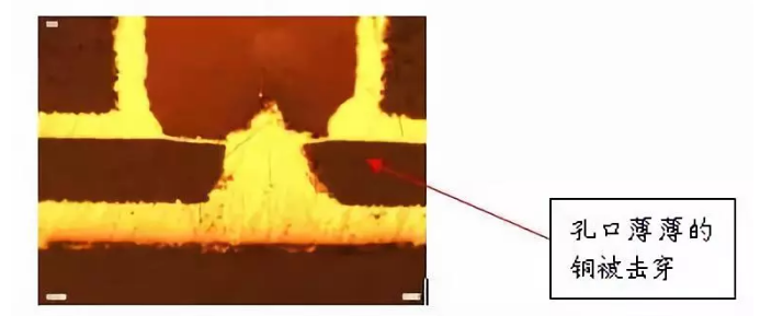 目前在行業通行的標準(IPC-650)里面,似乎還沒有給出對于樹脂塞孔的孔上面銅厚的要求,潛在的風險是,一旦樹脂塞孔的孔上面電鍍的銅厚偏薄,經過內層HDI線路的表面處理,棕化處理以后,孔口上面的薄薄的銅會有被激光鉆孔鉆穿的可能,而且在電測試時是無法判定其有問題的。但這層薄薄的銅在耐高壓等方面的品質著實讓人擔憂。